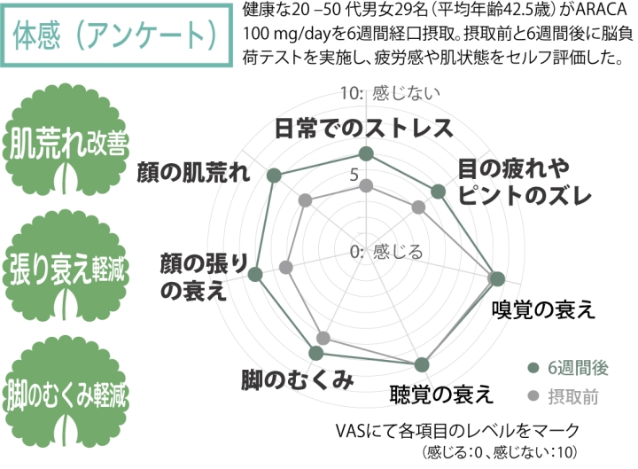 脳機能改善効果を試験する過程で、ヒトモニター試験において肌荒れや肌のハリ、足のむくみなどが改善されたと感じる方が多かったことから、ツボクサエキスが外用だけでなく内服でも肌状態の改善につながることが示唆され、当社ではツボクサエキス「ARACA」に美肌向けインナーケア素材としての新たな可能性を見出しました。